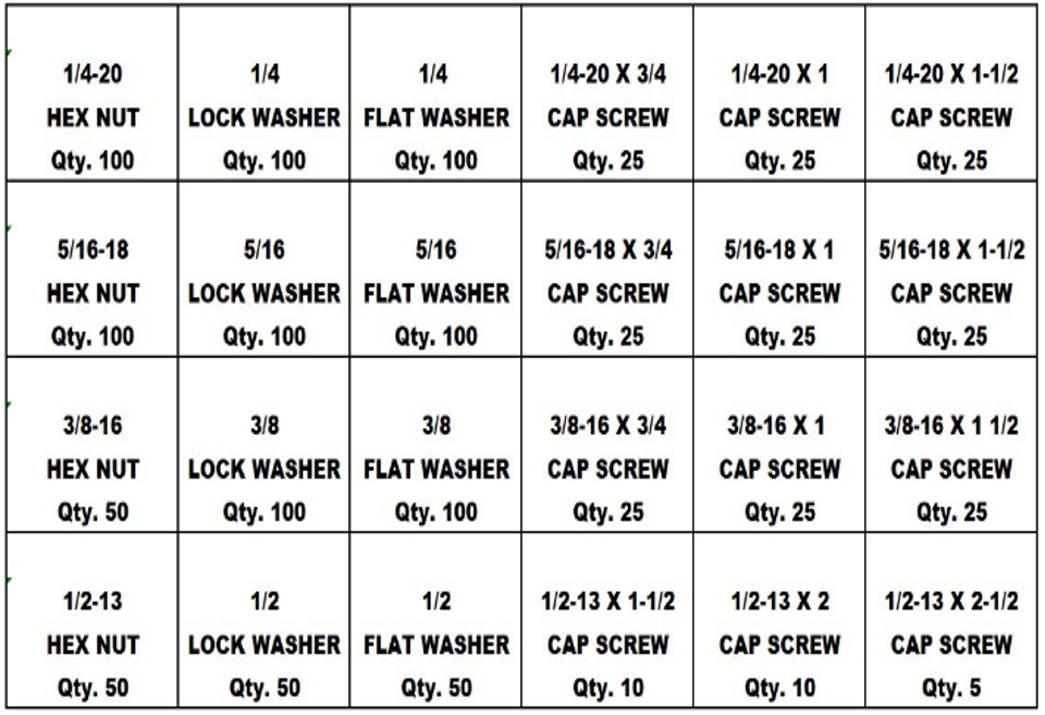 - 1,250-Piece Assortment – Includes a variety of Grade 8 hex bolts, hex nuts, lock washers, and flat washers in 1/4, 5/16, 3/8, 1/2 diameters