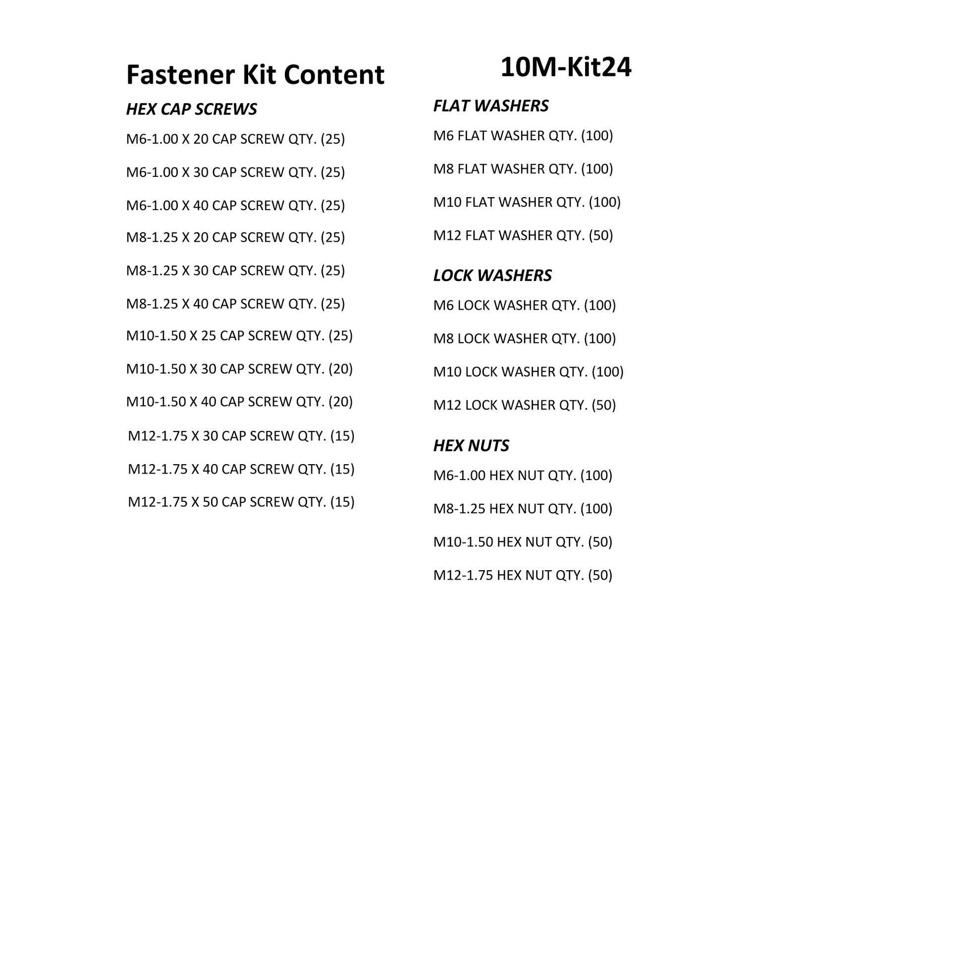 - 1,260-Piece Assortment – Includes a variety of Metric Class 10.9 hex bolts, hex nuts, lock washers, and flat washers in M6, M8, M10, M12 diameters