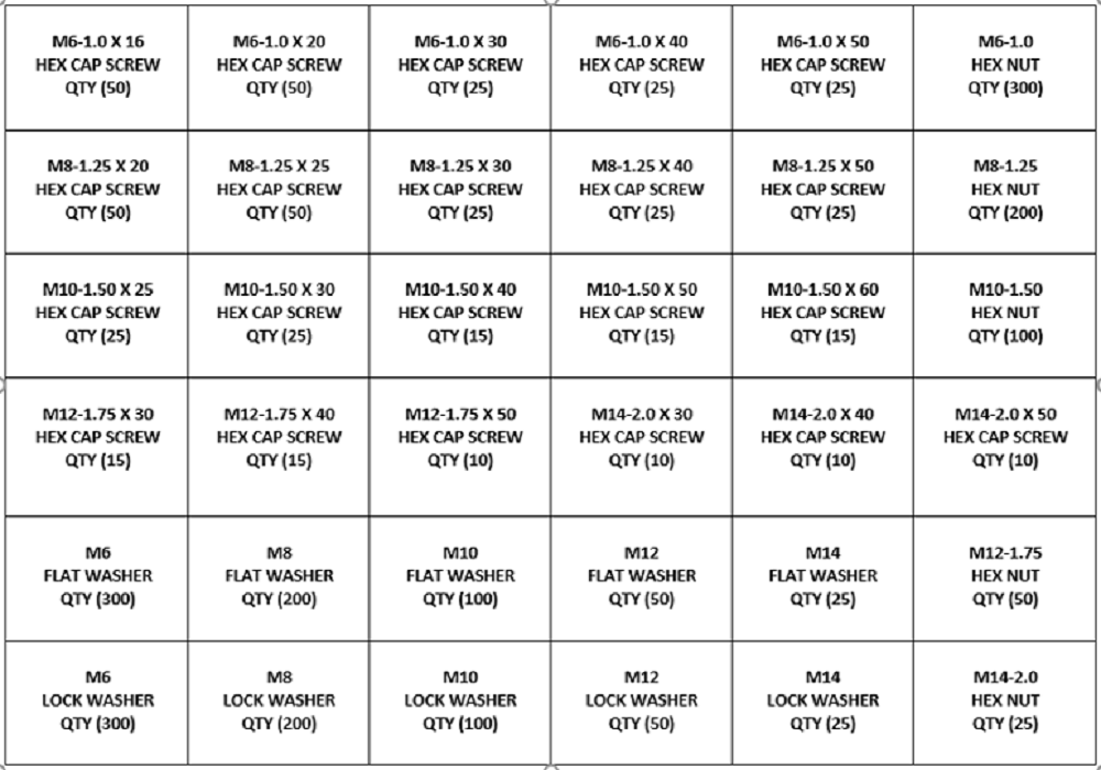 - 2,540-Piece Assortment – Includes a variety of Metric Class 10.9 hex bolts, hex nuts, lock washers, and flat washers in M6, M8, M10, M12, M14 diameters