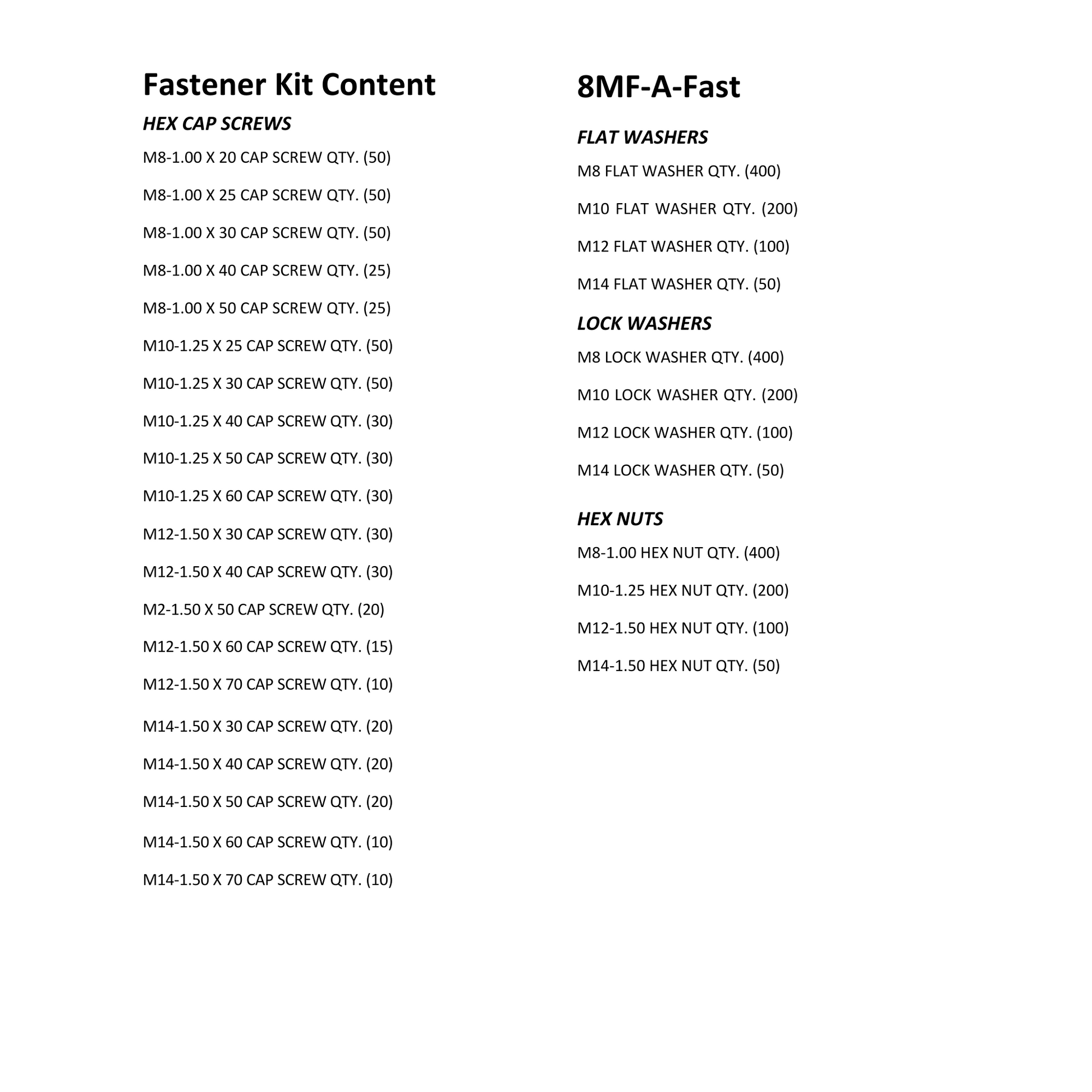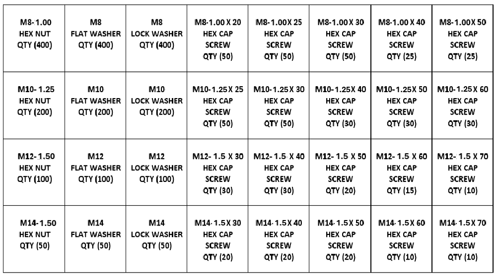 - 2,825-Piece Assortment – Includes a variety of Metric Class 8.8 hex bolts, hex nuts, lock washers, and flat washers in M8, M10, M12, M14 diameters