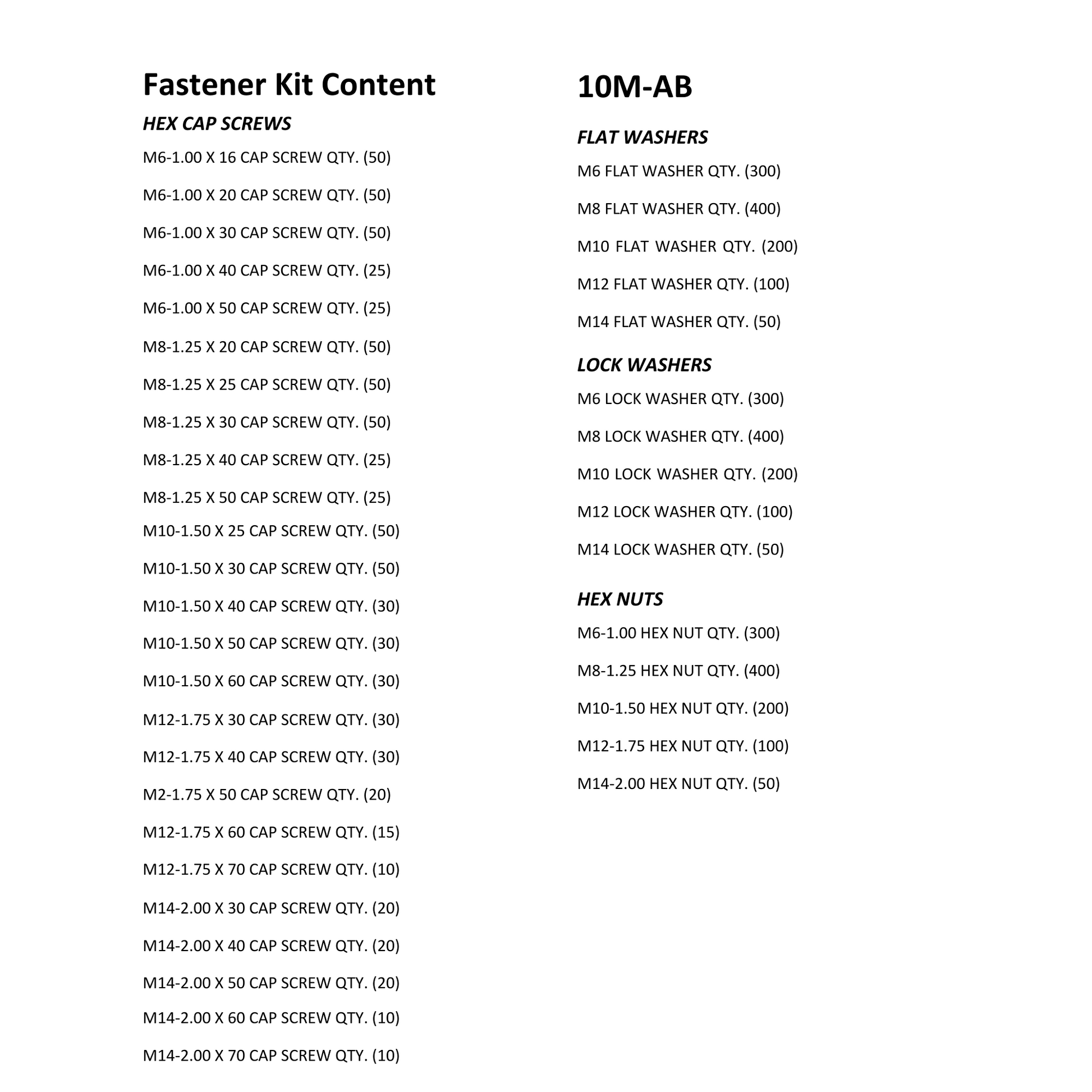 - 3,925-Piece Assortment – Includes a variety of Metric Class 10.9 hex bolts, hex nuts, lock washers, and flat washers in M6, M8, M10, M12, M14 diameters