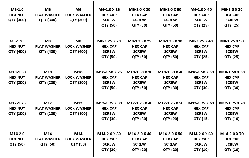 - 3,925-Piece Assortment – Includes a variety of Metric Class 8.8 hex bolts, hex nuts, lock washers, and flat washers in M6, M8, M10, M12, M14 diameters