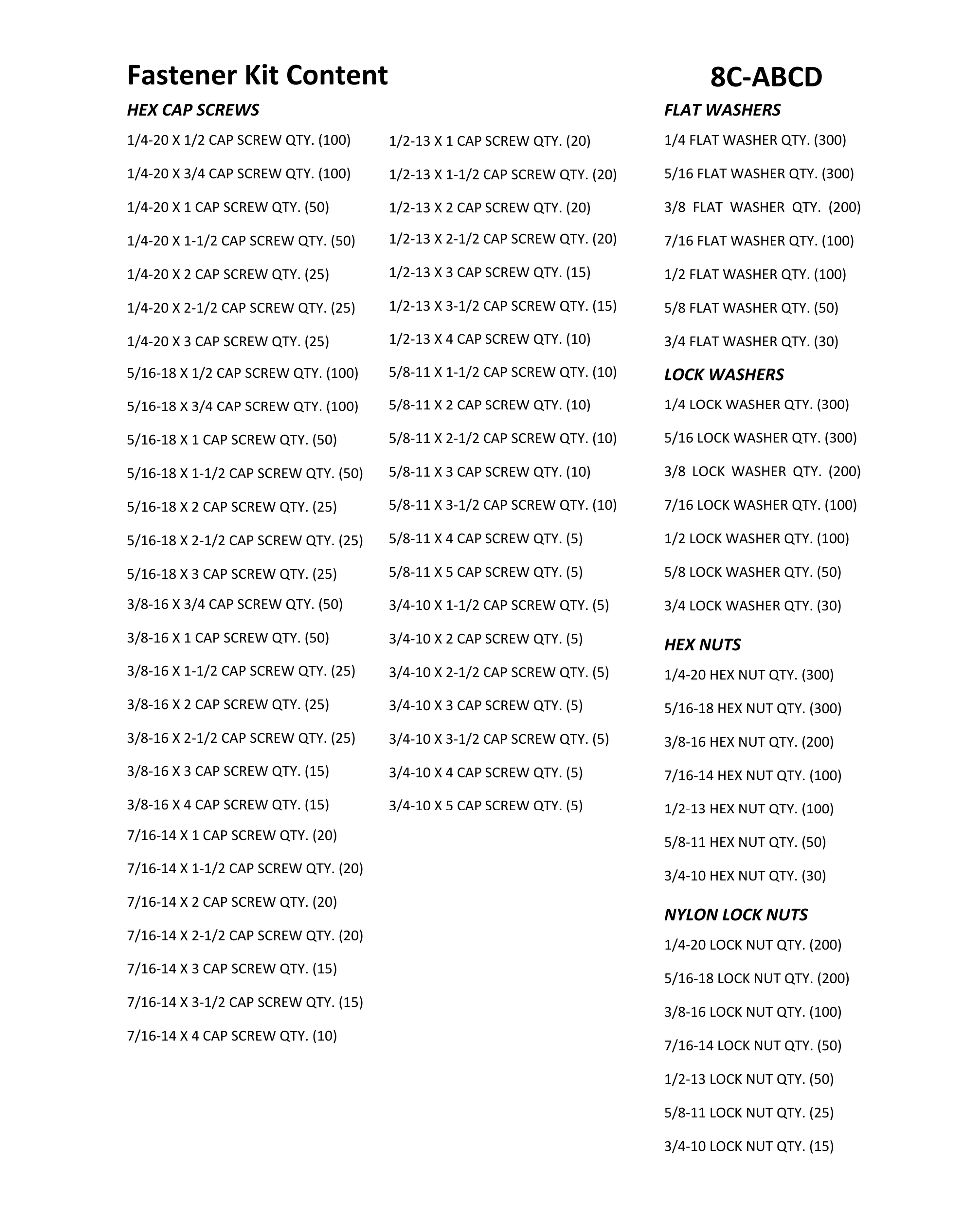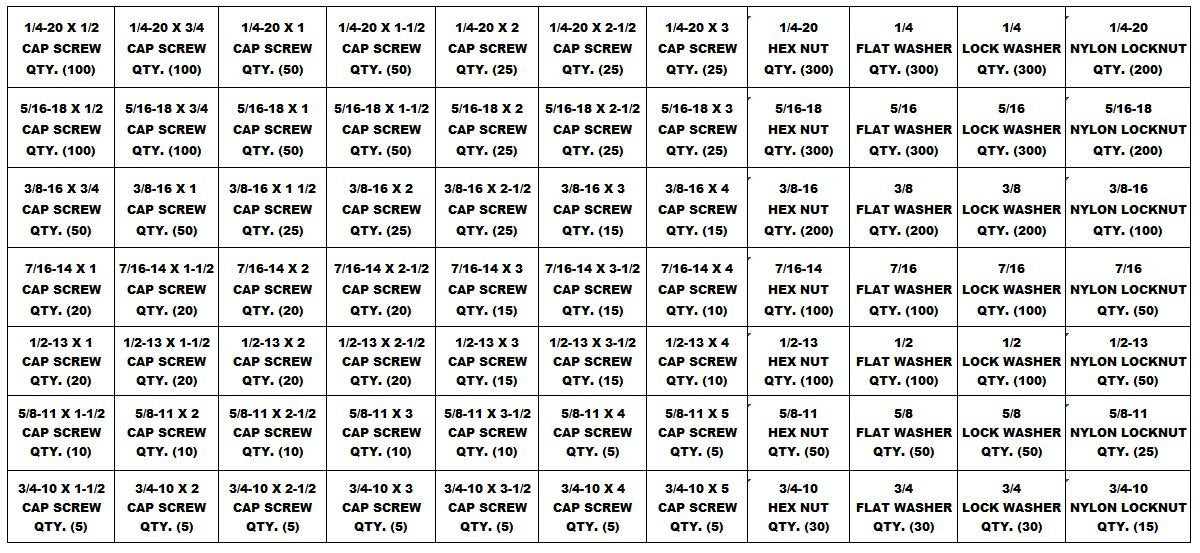 Get the durability and organization you need with this 5,170-piece Grade 8 Coarse Thread Fastener Assortment, complete with hex bolts, hex nuts, nylon lock nuts, lock washers, and flat washers in a range of sizes. All parts come individually bagged, labeled with a description and quantity so there’s no guess work while sorting through your fasteners. The perfect assortment for re-stocking your bolt bin, or if you already have your own storage setup.