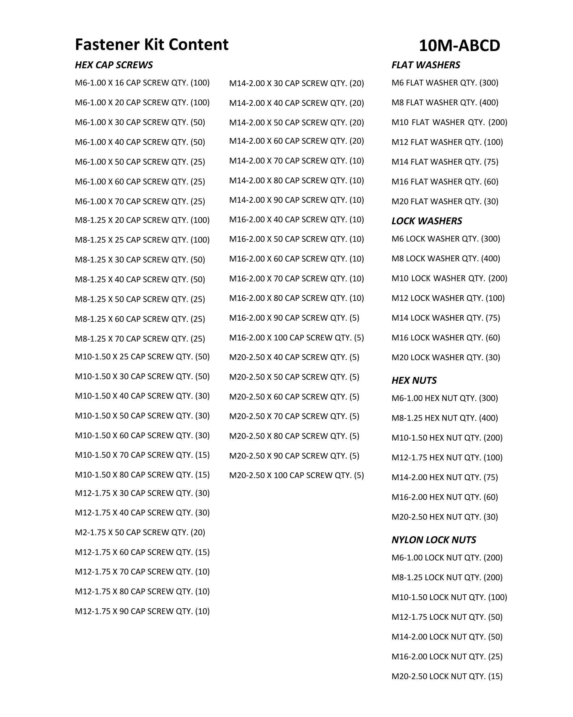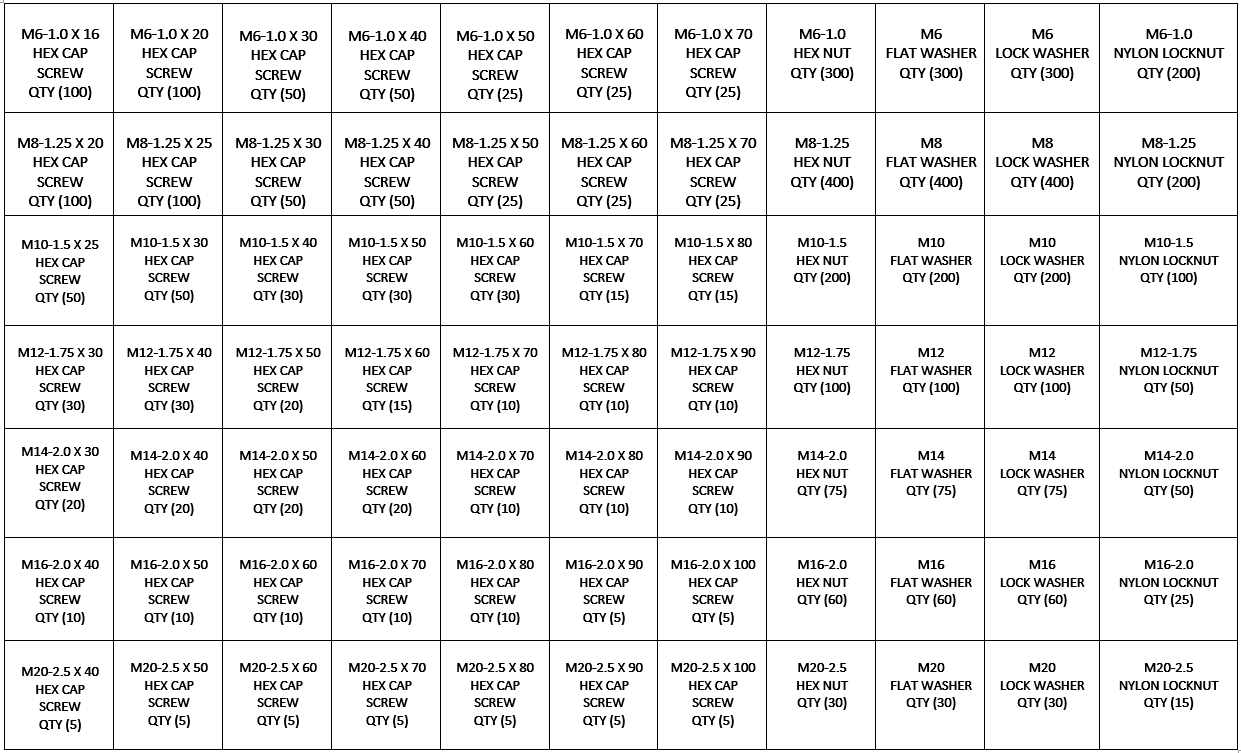 - 5,435-Piece Assortment – Includes a variety of Metric Class 10.9 hex bolts, hex nuts, nylon lock nuts, lock washers, and flat washers in M6, M8, M10, M12, M14, M16, M20 diameters