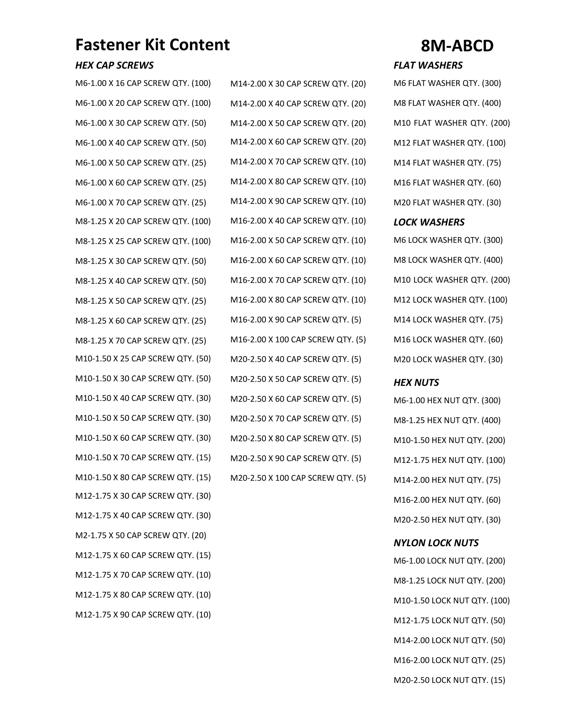 - 5,435-Piece Assortment – Includes a variety of Metric Class 8.8 hex bolts, hex nuts, nylon lock nuts, lock washers, and flat washers in M6, M8, M10, M12, M14, M16, M20 diameters