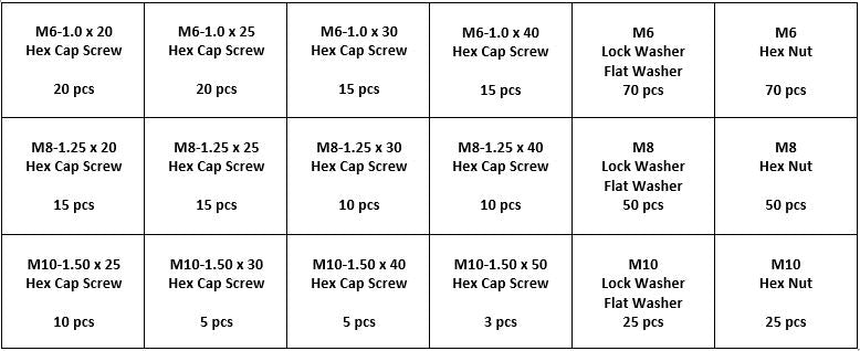 - 578-Piece Assortment – Includes a variety of Metric 10.9 hex bolts, hex nuts, lock washers, and flat washers in M6, M8, M10 diameters